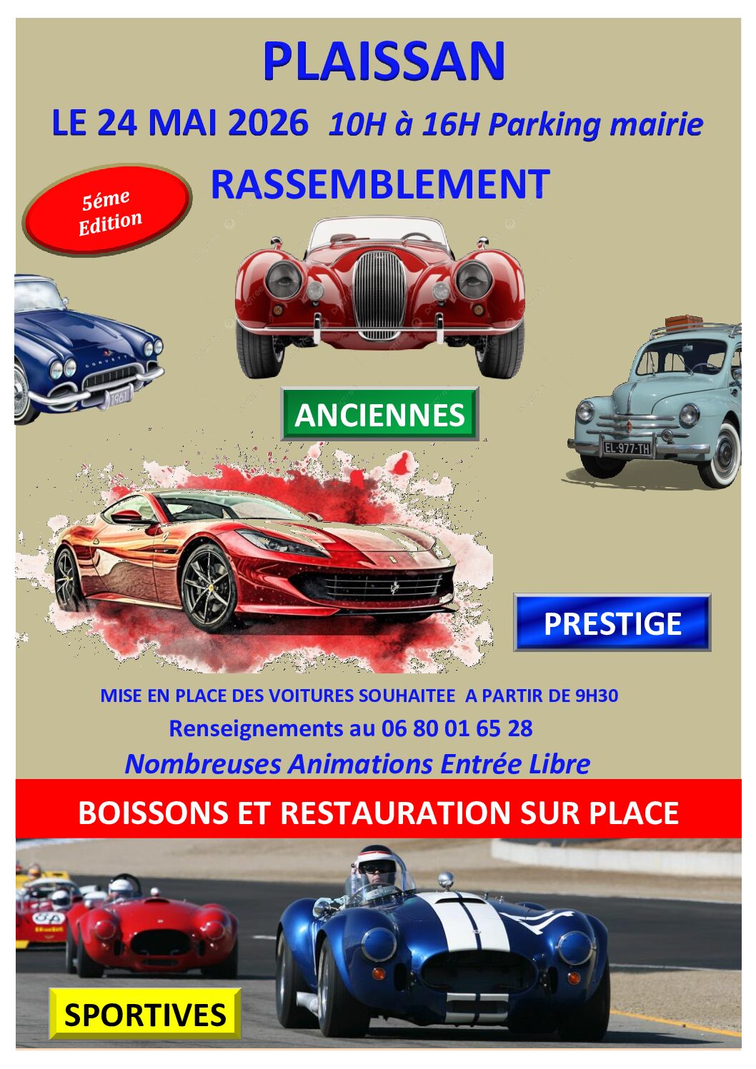 LA MAIRIE DE PLAISSAN organise pour sa Cinquième édition son rassemblement de voitures anciennes, sportives et de prestige. Une Journée pour découvrir de très belles voitures dans une ambiance familiale et festive. Nombreuses animations....